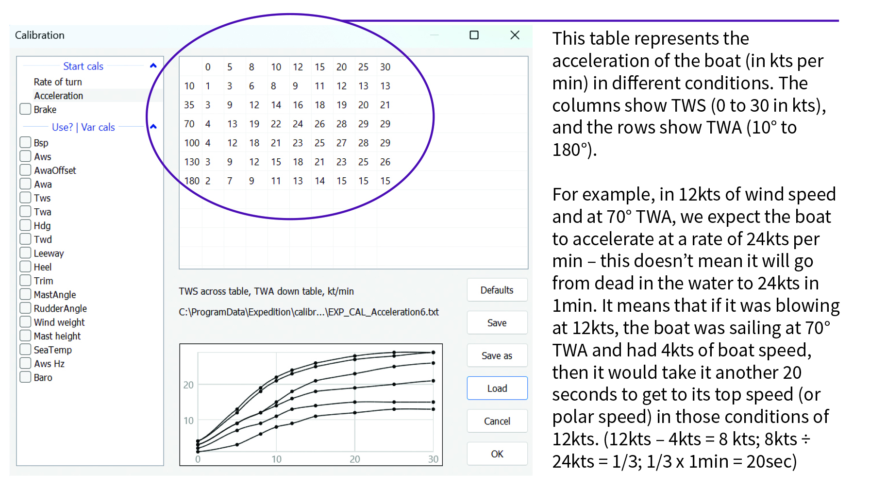 These two tables are designed to tell the software how fast a boat is accelerating in certain conditions (in particular, with a specific wind speed and a specific true wind angle), and how quickly the boat can turn (in degrees per second) in the same conditions.