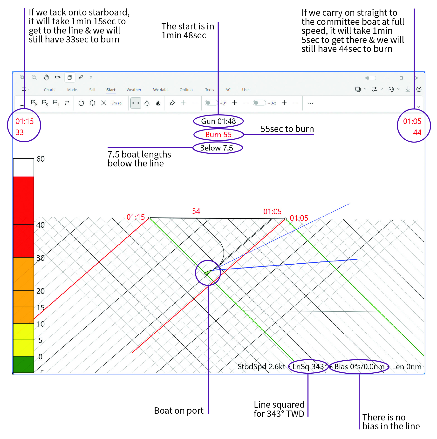 Basically, to understand how fast a boat can go from the current position to having the bow on the start line, the system needs to know all these things. And a single error in one of them will lead to a misleading burn time number.
